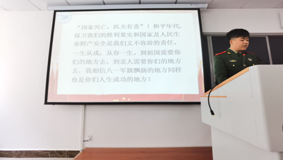 活动伊始,退伍军人王松以“参军报国,无上荣光”为主题发表演讲,鼓励同学们积极应征入伍。演讲中,他分析了如今国内外紧张的形势,并结合自身入伍经历,细致地为在场同学们分享了部队生活。及至演讲末尾,他由衷地祝愿同学们把握机遇,积极参军入伍,演绎更精彩的人生!