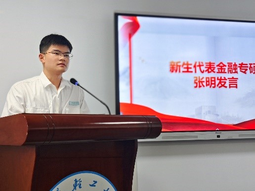 2023级金融专业研究生张明同学代表全体新生发言,他从什么是读研、为什么要读研、在研究生期间如何求学三个方面分享自己对读研的期待和认识,并呼吁全体研究生一起凝聚奋进力量,实现鸿鹄之志,用实际行动去书写和践行“强国有我”的誓言。