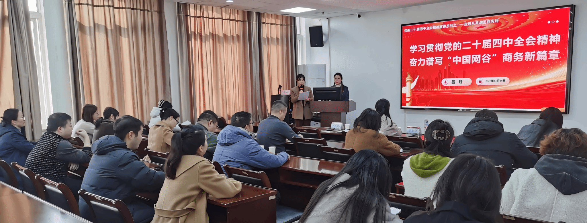 宣讲会以“学习贯彻党的二十届四中全会精神 奋力谱写‘中国网谷’商务新篇章”为主题,分为三个部分展开:“第一部分:登高望远——全会精神的核心要义与时代逻辑”“第二部分:脚踏实地——东西湖‘十五五’蓝图与‘新战场’”“第三部分:实干笃行——商务系统的使命担当与行动部署”。本次宣讲全面阐述了党的二十届四中全会精神,并紧密结合东西湖区“十五五”规划与商务系统工作实际,提出要从传统的“招商”向“选商育链”转变,全力服务“中国网谷”建设,加快构建热带雨林式的创新生态。