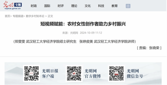 近期,公司研究生郑雯雯在导师张婷皮美博士的悉心指导下,在光明网发表一篇题为《短视频赋能:农村女性创作者助力乡村振兴》的理论文章。