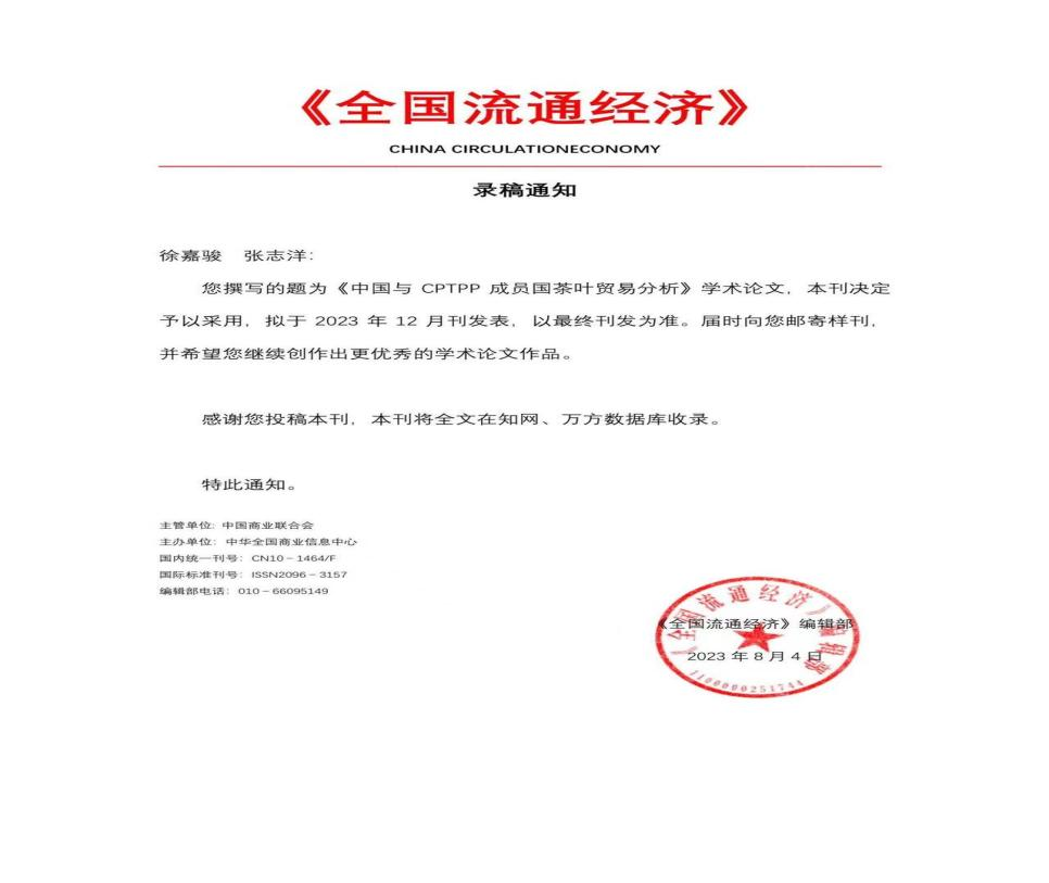 在科研方面,他积极参与2023年湖北省老员工创新创业训练计划。主持了一项省级项目,利用暑期,他深入产地、消费者等调查对象,真正了解茶叶国内外流通现状,定价方式,品类质量等信息,通过问卷收集与数据分析,以问题导向切入,研究分析中国茶叶与CPTPP成员国贸易互补性与优势。最终产出名为《中国与CPTPP成员国茶叶贸易分析》(第一作者)论文,发表在国家级期刊,被知网收录。他并没有因此止步,他认为,有结果产出,能发表,是对自己的认可,但绝对不是骄傲的理由,接下来的学习生涯,他依旧充满对于学术的满腔热情,在拓宽知识面的同时,不断加强自己的学术能力,以此产出更多科研结果。