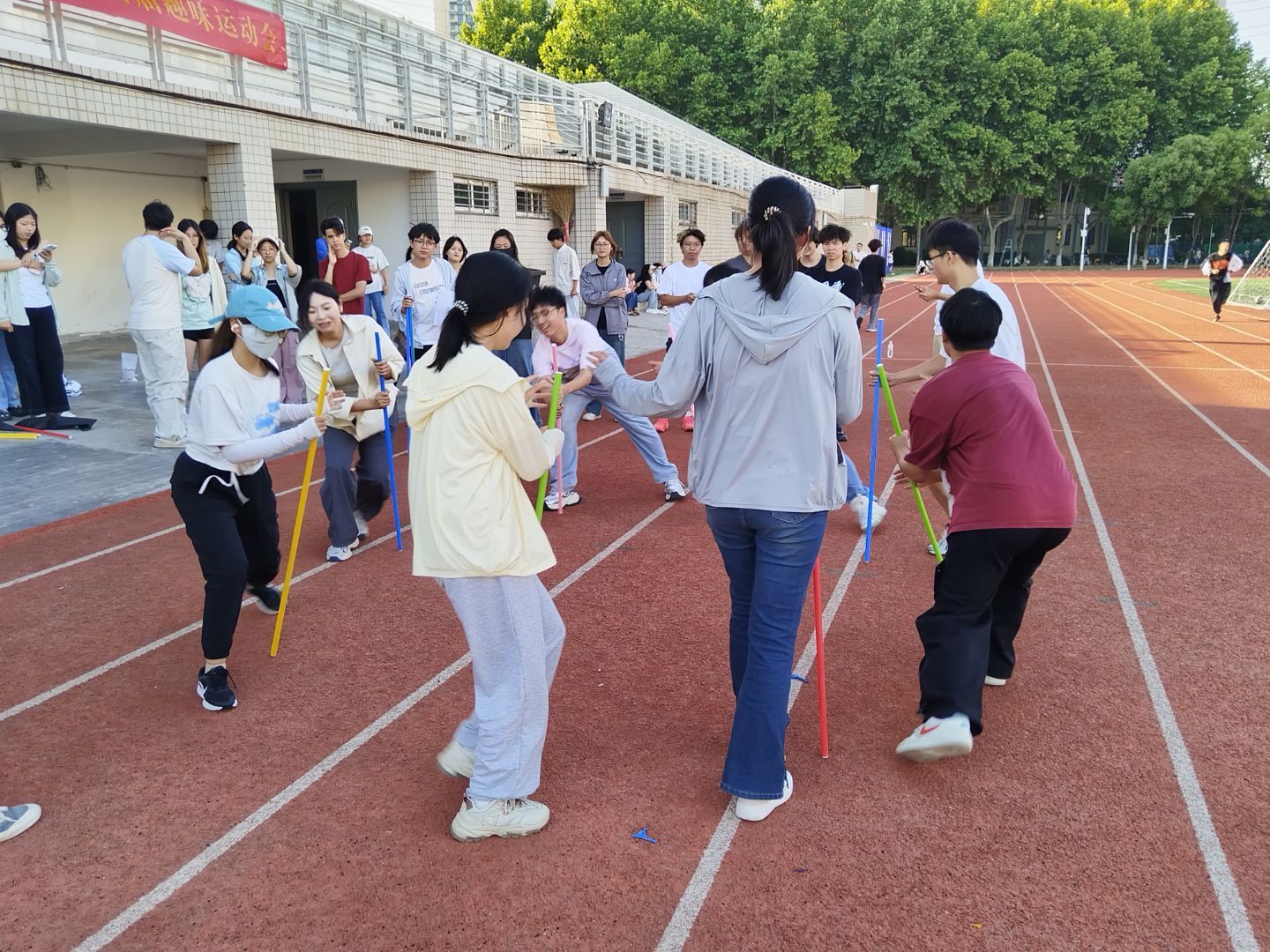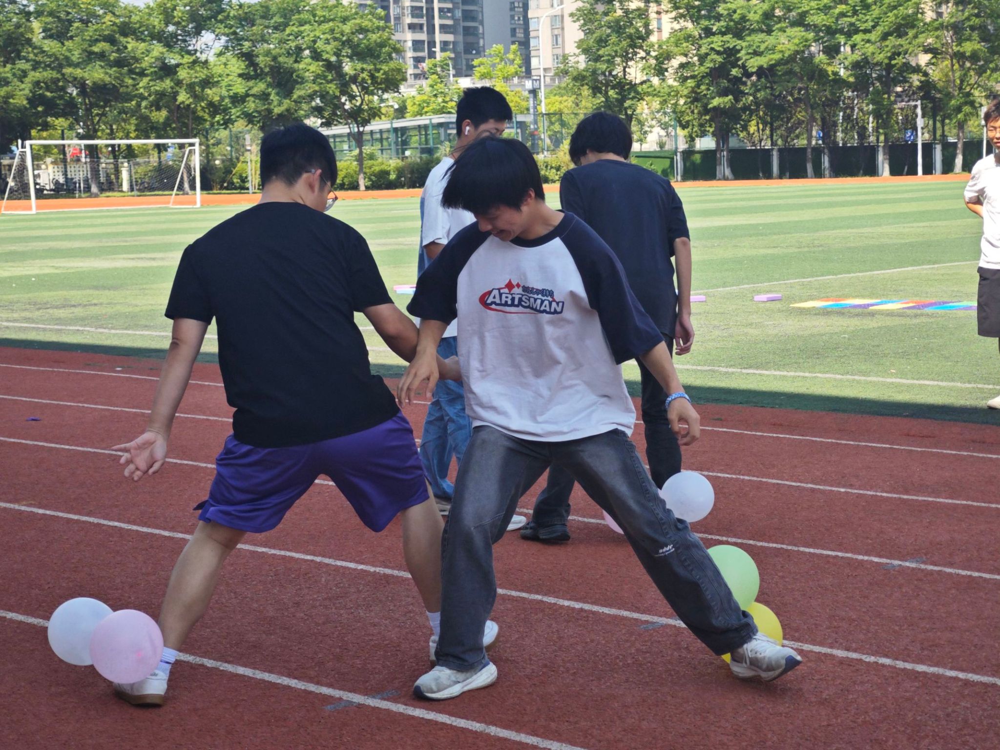 赛场上,同学们全情投入,你追我赶,既有体力对抗的激情,也有智慧碰撞的火花。拔河比赛现场,各班紧握麻绳,憋足劲后仰发力,涨红的脸庞与滴落的汗水诠释着拼搏精神;“能量传输” 项目,队员们齐声喊着口号,每一次精准配合都赢得阵阵喝彩;踩气球环节,一组相向一冲而上,一对一相互争着踩破绑在对手腿上的气球。各班级奋勇争先,默契配合,场边观众热情高涨,欢呼声与掌声交织,将活动推向高潮。