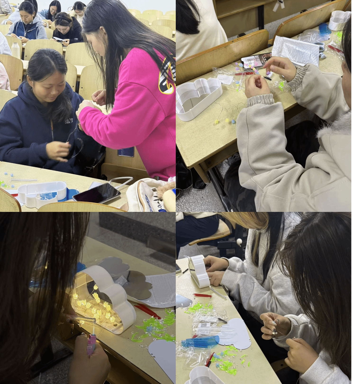 活动伊始,工作人员播放了教程视频,详细讲解制作步骤,并现场演示操作流程。同学们在轻松愉快的氛围中展开创作。制作过程中,大家彼此交流、互相帮助,分享创意灵感。当温暖的灯光缓缓亮起,内心的焦躁被抚平。