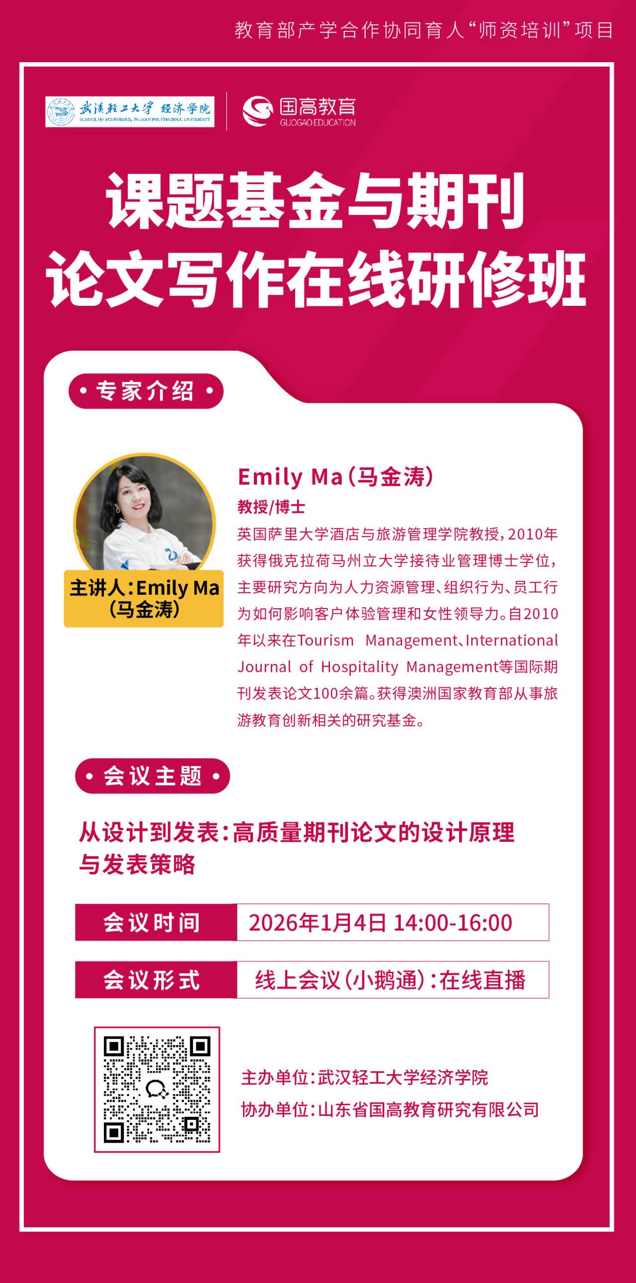 主讲人:马金涛 Emily Ma,英国萨里大学酒店与旅游管理公司教授,于2010年获得俄克拉荷马州立大学接待业管理博士学位,主要研究方向为人力资源管理,组织行为,员工行为如何影响客户体验管理和女性领导力。自2010年以来在《Tourism Management》、《International Journal ofHospitality Management》等国际期刊发表论文100余篇。具备在澳洲,美国和英国教育行业的工作经历旅游教育和创新研究经验丰富,并获得澳洲国家教育部的基金从事旅游教育创新相关的研究。