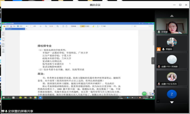2020年6月4日下午3时,腾讯线上会议室热闹非凡,金融系在此举行“2020届考研分享会”。会议由金融系主任邢慧茹老师组织,王亚君、祁好英、李霜等老师参加了本次交流会。据悉2020年金融系考研拟录取员工人数再创新高,达到了14人。参加本次经验交流有顺利考上研究生的2016级金融系员工:史琪蕾(中央财经大学);朱皖秋(河海大学);谢林彤(上海大学);韩远帆、肖灿(武汉理工大学);汤晔蕾(福州大学);徐聪(华中师范大学);王蓉(深圳大学);蔡佳明(南京审计大学);李适宜(新疆农业大学)等。同时还有特邀嘉宾4名:李嘉旭(2016国贸,中国人民大学);方振(2016电气,湖北省社科院跨考产业经济学);陈瑾(2015级金融,华科金融专硕);黄琳(2015级金融,财大投资专硕)。参加经验交流会的有2017级、2018级金融系准备考研的员工。